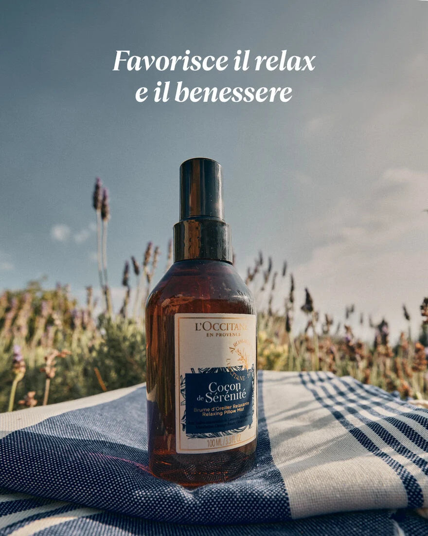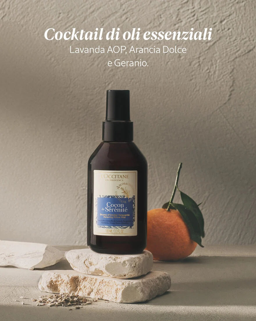• Lo Spray per cuscino rilassante Coccole di Serenità 100ml, da vaporizzare in camera ogni sera, crea un'atmosfera di intenso relax, favorendo riposo e benessere. Fragranza unica composta da un cocktail di oli essenziali, come Lavanda DOP (Denominazione di Origine Protetta), Arancia Dolce e Geranio. Il nostro Spray per Cuscino profuma la casa e la biancheria da letto