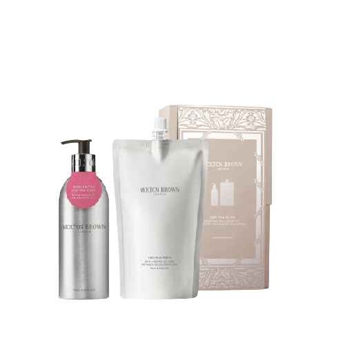 The iconic woody Fiery Pink Pepper fragrance in a refillable bath set.