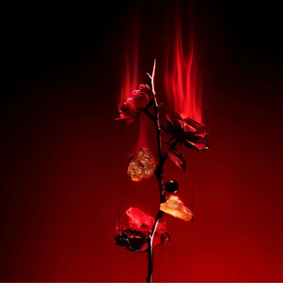 L’inizio si apre con una rosa rossa scura, quasi fumosa, attraversata da scintille profonde, rosso sangue, come un sentimento che brucia e consuma. Poco dopo emergono l’incenso e l’inchiostro, come se l’ultima poesia fosse appena stata vergata su carta. Le aldeidi metalliche aggiungono tensione drammatica, mentre l’opoponax riscalda e avvolge la pelle con una sensazione misteriosa e persistente.